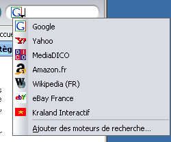- Comme vous le voyez sur la page Recherche, vous pouvez installer un plug-in Firefox pour rajouter un moteur de recherche à ceux déjà présents dans la barre de recherche Firefox (le truc à côté de la barre d'adresse). Si vous acceptez, il vous suffira ensuite de dérouler la liste des moteurs de recherche pour sélectionner celui-ci et entrer alors le ou les mots voulus. Un jeu d'enfants !