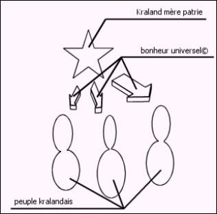 1/ Kraland, en tant que nation, doit assurer non seulement la sécurité, la protection, la culture et la prospérité à son peuple, elle doit aussi assurer son bonheur, qui déjà à l'époque, est appelé Bonheur Universel©.