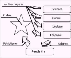 La nation de Kraland est composée d'un gouvernement, et de 4 points importants. Ceux-ci, la science, la guerre, l'idéologie et l'économie, représentent les 4 piliers de la république, en plus du cinquième qui est en train de se former, son peuple. Ainsi, chaque domaine doit recevoir ses subventions, mais afin de compter sur le plus grand des soutiens, celui des kralandais, il faut insister sur un point: l'économie, qui fera les salaires des kralandais, donc leur vie, et qui leur vaudra, en échange, une reconnaissance patriotique.